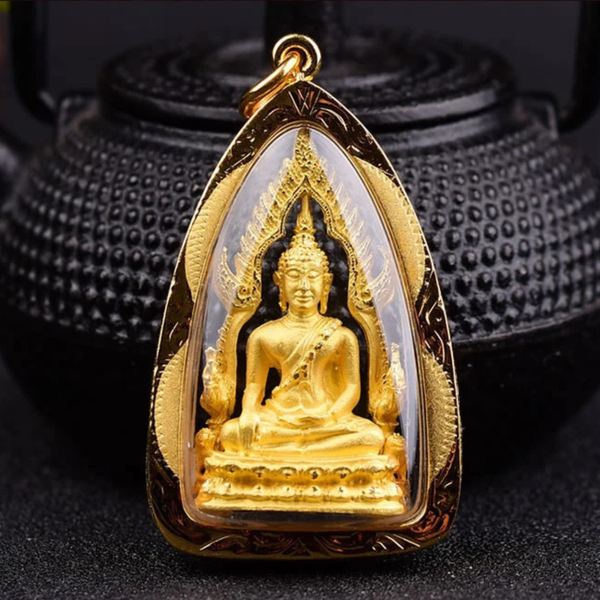 Amulette de protection Bouddha Phra Chinnaraj dorée en provenance de la Thaïlande.